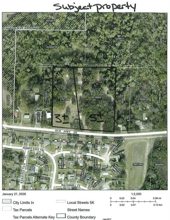 Fresh on the Market! Family owned since 1980..8+- Beautiful acres High and Dry with scattered oaks, approximately 590 feet fronting Old Hwy 50, just West of the Town of Montverde. Montverde being the home of prestigious Montverde Academy, The Club @ Bella Collina gated lakefront and golf community, Siena @ Bella Collina Hotel, etc... This one of a kind property is possible development, one estate homesite, or is available split as 3+- acre homesite and 5+- acre homesite individually. Many options to consider. (1948 Single Family Residence 2/1, 786 sqft detached garage are on property)